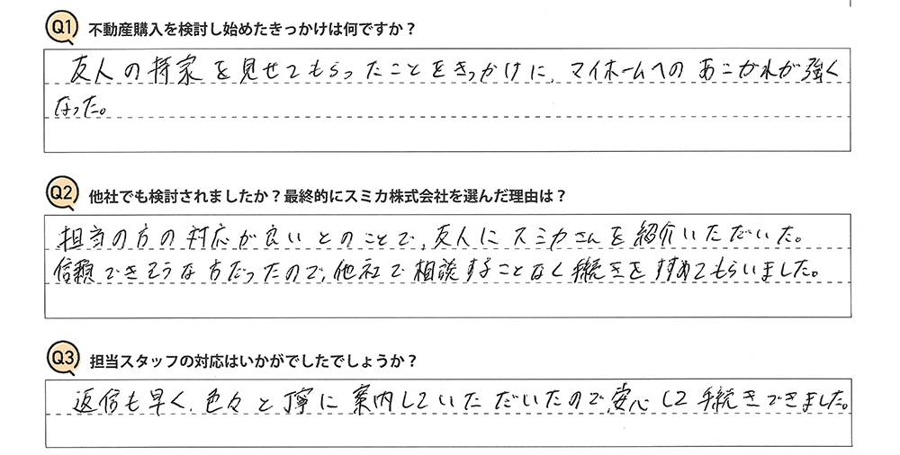 A 担当の方の対応が良いとのことで、友人にスミカさんを紹介いただいた。
