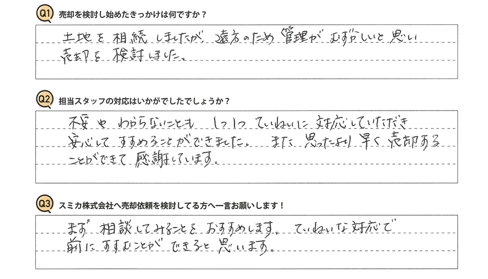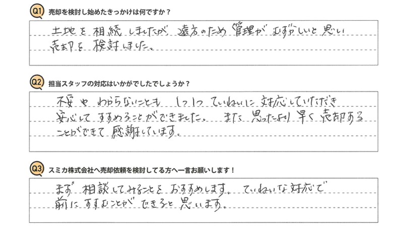 Q スミカ株式会社へ売却依頼を検討してる方へ一言お願いします!