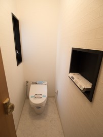 トイレはタンクレスのサティスS、手摺を2か所につけました。