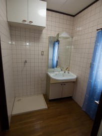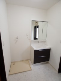 洗面台は三面鏡のL.C.を採用、2段フルスライドの引出で出し入れしやすくなっています。
