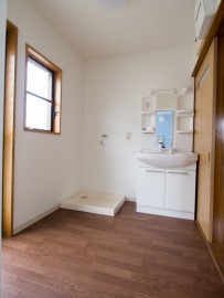 お風呂入れ替えに伴い、隣接する洗面脱衣所のクロスとクッションフロアも貼り替えています。