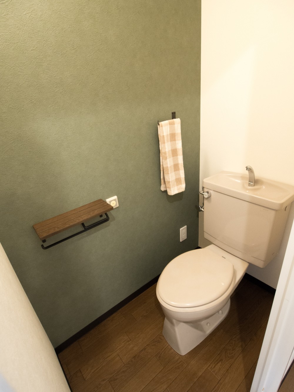 トイレもイメージを統一し、カーキのクロスをアクセントにしました。