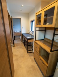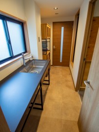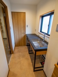ということで調理機器無しの、シンクのみのカウンターにアイアンフレーム、ポイントにオーク色の板を貼って、応接室やトイレと全体的に雰囲気を合わせました。