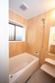お風呂はPanasonicのオフローラ、こちらもいかにもユニットバスです!感をなくすために“一面アクセントパネル”ではなく“全面同色パネル”を採用しています。